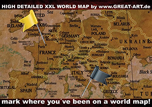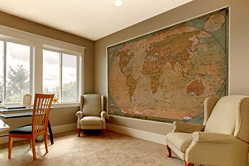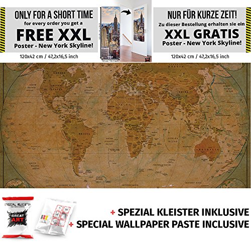 Beautify your rooms with this breath-taking motif by GREAT ART® An amazing design wallpaper showing a world map rich in detail and of high definition in a very nice style - Retro Vintage. A detailed world map with the biggest and most important cities on it, capital cities are marked with a star. Additionally, the world is shown as a globe in four different perspective in the corners of the wallpaper. Top left: Perspective from North Pole Top right: Perspective from South Pole Bottom left: Perspective from Middle of Asia Bottom right: Perspective from Middle of Australia The wallpaper has an unique design and is definitely an eye catcher. Whether in your living room, dining room or as a wall decoration in your living room, the wall paper is perfect for every occasion. The picture is of high quality and high definition. Full of details and qualitative, this wallpaper will give you a unique experience. The wallpaper consists of one panel and has a total size of 55 Inch x 39.4 Inch. You can mount the photo wallpaper with wallpaper paste or you can use it as a wallpaper or poster. The picture is of a very high quality with high resolution and covering colours. The paper is quite sturdy and the picture can be wallpapered over existing wallpaper. Instructions will be provided. Check out our shop for more motifs, art und great offers! ••• Only for a short amount of time! Get a New York Skyline poster (48 Inch x 17 Inch) with this order for free! •••