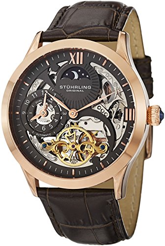 -. Binding : Watch -. Brand : Stuhrling Original -. Department : mens -. EAN : 0847988027991 -. Feature : Watch with skeleton dial featuring am/pm indicator at 12 o'clock, jewel-capped crown, and dual-time display at 9 o'clock / 44 mm 16k rose gold-layered stainless steel case with Krysterna crystal dial window / Automatic self-wind movement with analog display / Croco-embossed genuine leather band with buckle closure / Water resistant to 50 m (165 ft): In general, suitable for short periods of recreational swimming, but not diving or snorkeling. -. IsAdultProduct : 0 -. Label : Stuhrling Original -. Manufacturer : Stuhrling Original -. Model : 571.3345K54 -. MPN : 571.3345K54 -. PackageQuantity : 1 -. PartNumber : 571.3345K54 -. ProductGroup : Watch -. ProductTypeName : WATCH -. Publisher : Stuhrling Original -. ReleaseDate : 2013-02-21 -. Studio : Stuhrling Original -. Title : Stuhrling Original Men's Classic Winchester Tempest II 16k Rose Gold-Plated Brown Leather Strap Watch -. UPC : 847988027991
