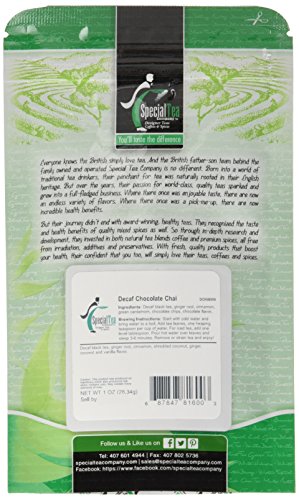 -. Binding : Grocery -. Brand : Special Tea -. EAN : 0687847816003 -. Feature : Makes about 12 cups of premium loose leaf tea / We use whole loose tea leaves have all their essential oils intact, so the flavor, quality and health benefits are maintained; Most store bought bagged teas contain only inferior leaf fragments and tea dust / Hand packed in the USA -. Label : Special Tea Company -. Manufacturer : Special Tea Company -. MPN : 687847816003 -. NumberOfItems : 1 -. PackageQuantity : 1 -. PartNumber : 687847816003 -. ProductGroup : Grocery -. ProductTypeName : GROCERY -. PublicationDate : 2015-06-23 -. Publisher : Special Tea Company -. ReleaseDate : 2015-06-23 -. Size : 1 Ounce -. Studio : Special Tea Company -. Title : Special Tea Loose Leaf Black Tea Sampler, Decaf Chocolate Chai, 1 Ounce -. UPC : 687847816003