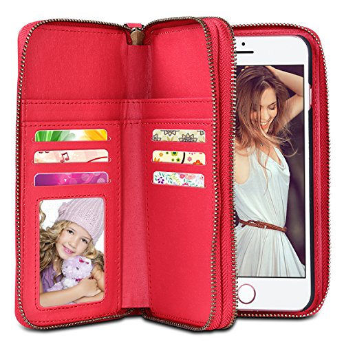 -. Feature : Zipper wallet for iPhone 7, inside with a detachable magnetic slim case and mirror / Multiple compartments can carry 9 cards (credit/debit cards, ID, driver license) and cash / Detachable design allows you to answer or play phone without holding an entire wallet / Case and wallet 2 in one, super convenient for daily use, zipped pouch is 100% safe / Quality zipper and PU leather ensure durability and easy to operate, with wristband