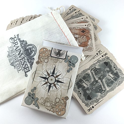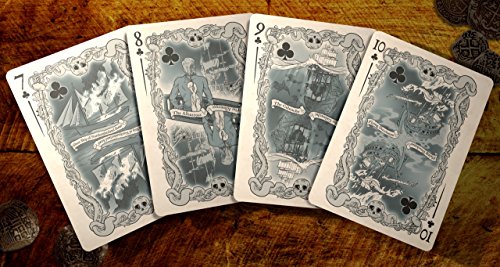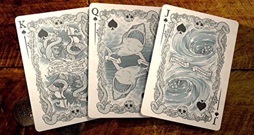 This 54 card deck is about the dichotomy of a life at sea. The red side of the deck; hearts and diamonds; explores famous sailors, explorers, pirates, and privateers of the age of sail. The court cards focus on the actual historical figures of the time and the cards ranked 2-10 of the hearts and diamonds feature different types of ships. The dark side of the deck explores the dangers sailors would face; be them real or fantasy. Court cards for the spades and clubs explore the monstrous creatures thought to lurk below the waves, while the ranked 2-10 cards focus more on superstitions and ghost ships. Custom designed playing card deck by Brain Vessel Cargo, manufactured by Bicycle to guarantee quality. Kickstarter launched deck.