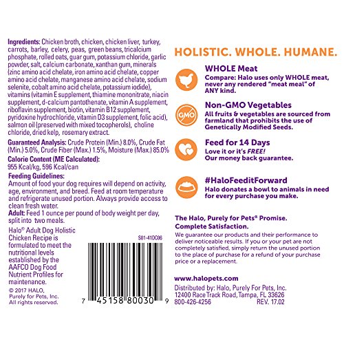 Halo uses real WHOLE meat, poultry, or fish, and NO "meat meal" of ANY kind in our natural dog food. We also have dog food options for special diets, including puppy food, small breed dog food, vegan dog food, senior dog food, and grain free dog food. At Halo, WHOLE Makes a Whole Lot of Difference is the philosophy that drives our holistic approach to ingredient sourcing, recipes, nutritional value, the welfare of ALL animals, and our overall mission to change the way companion animals are fed and farm animals are raised…for the better!Feature