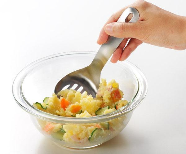 | つぶす、混ぜる、盛り付けるが一本で出来るスプーン型ポテトマッシャーです。スプーンのような形状なので、混ぜたりすくったりしやすくなっています。ポテトサラダ作りやゆで卵をつぶすのにぴったり。アボカドやフルーツのマッシュ、離乳食作りにも便利に使えます。大きいものは先端で切ることも出来ます。穴あきサーバースプーンとしても使えます。キッチンの引き出しにも収納しやすいコンパクトなサイズ。 |