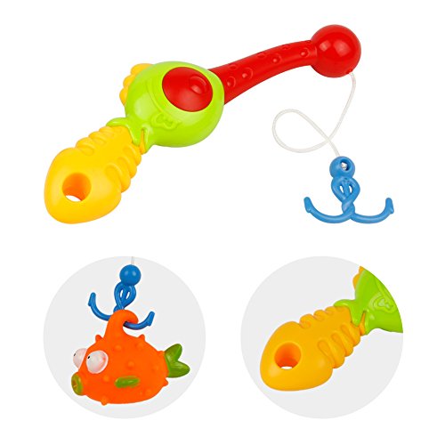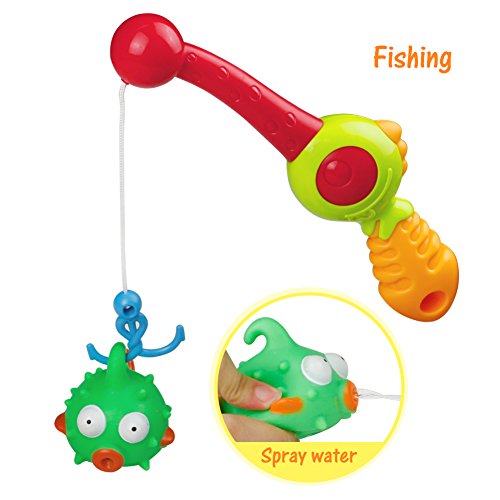 All cute fishes can float at leisure on the water,kids use the fishing rod to catch them,develop hand-eye coordination.And fishes will sprinkle when you squeeze their body,provide hours of fun during bathtime.