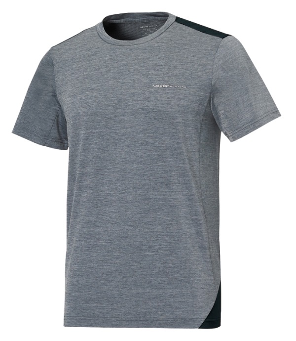 촉감이 우수하고 활동성이 뛰어난 소재를 전판에 사용하고, 통기성이 우수한 매쉬 소재를 등판에 사용한 남성 러닝 라인의 라운드 티셔츠