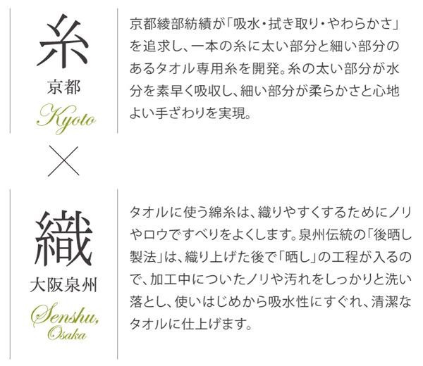 | 京都・綾部紡績が「吸水・拭き取り・やわらかさ」を追究して生まれたタオル専用の糸を使用。大阪泉州伝統の後晒し製法で、吸水性に優れたタオルに仕上げました。 |