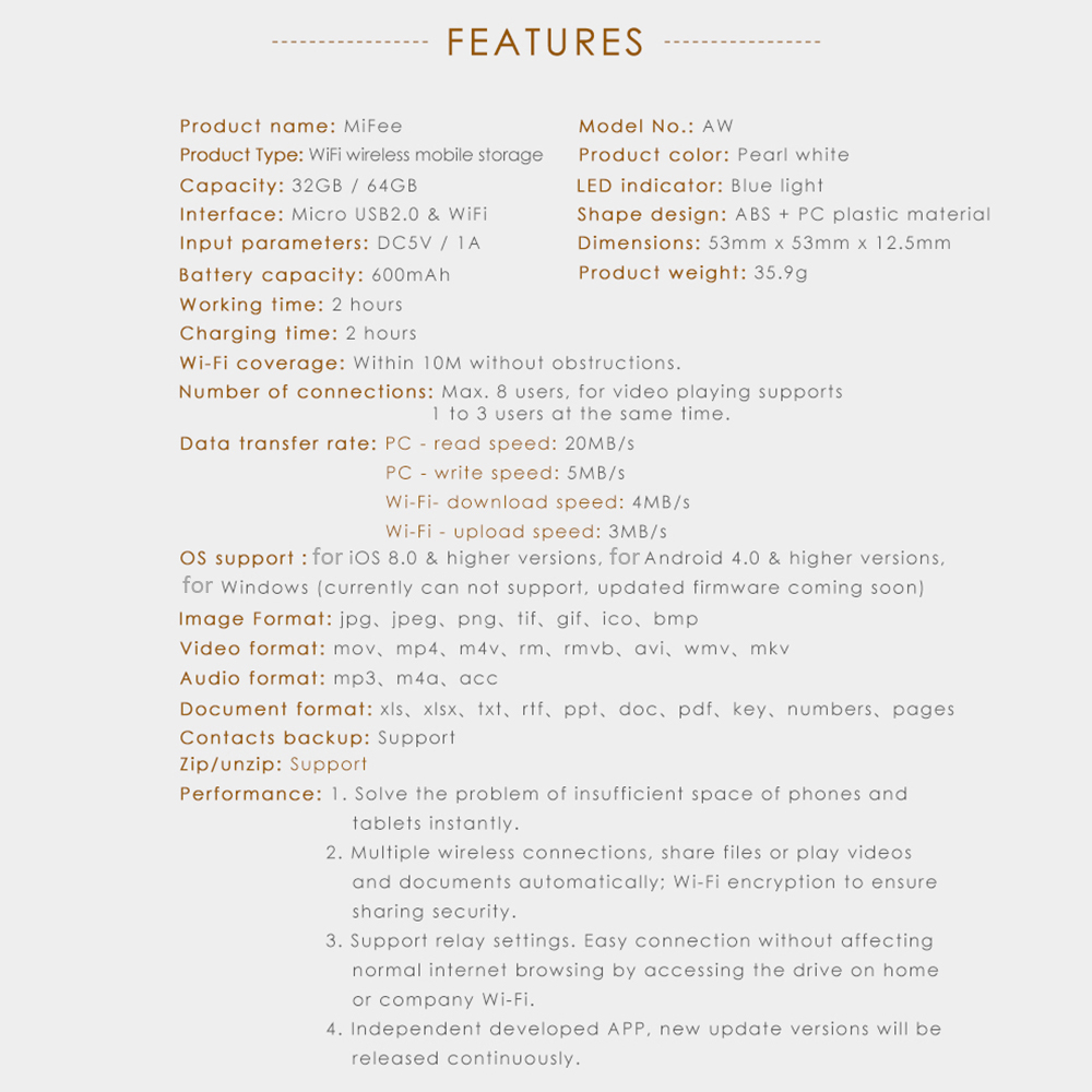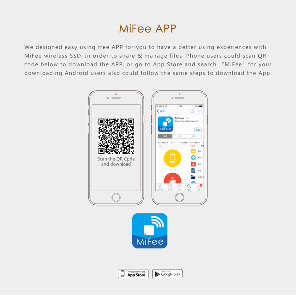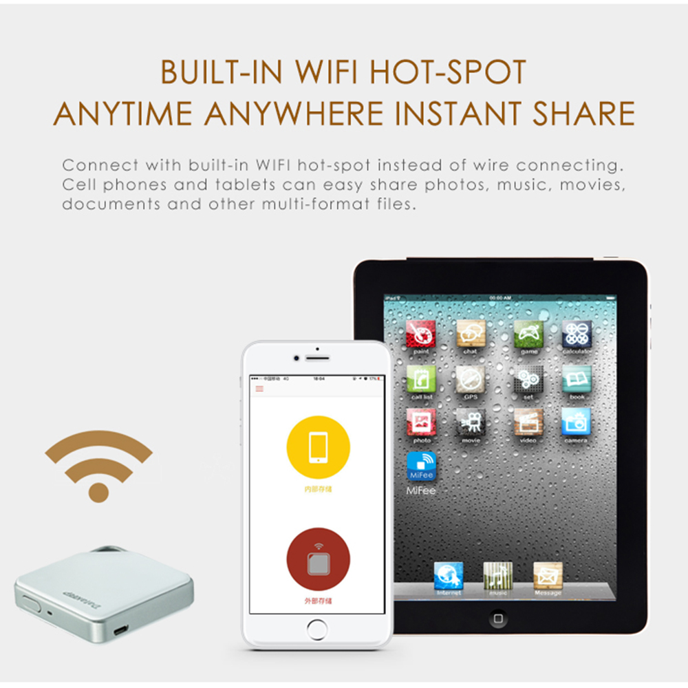 MiFee is a professional wireless smart portable SSD, connecting with hardware and mobile devices by WiFi to realize dada transmission. Support encryption function for files security and support multi-connection for up to 8 devices for sharing files, videos and photos. Compatible for Android and for iOS devices.