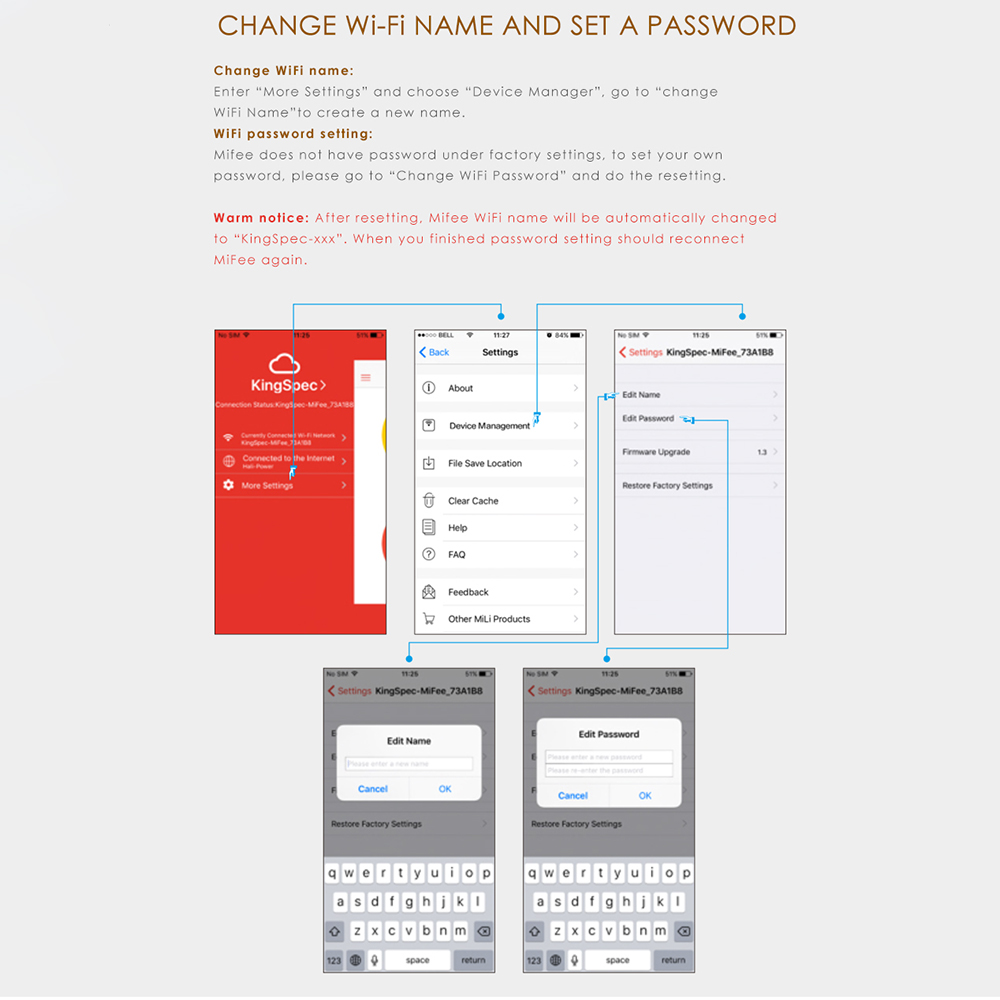 Press the button for 3 seconds to turn on Mifee; then open your phone and WiFi setting and find “KingSpec-Mifee_xxx” to connect it (default settings do not have password, you could set your own WiFi password on the APP). After wifi connected successfully, the indicator light will blink several times, then your Mifee is ready to go.