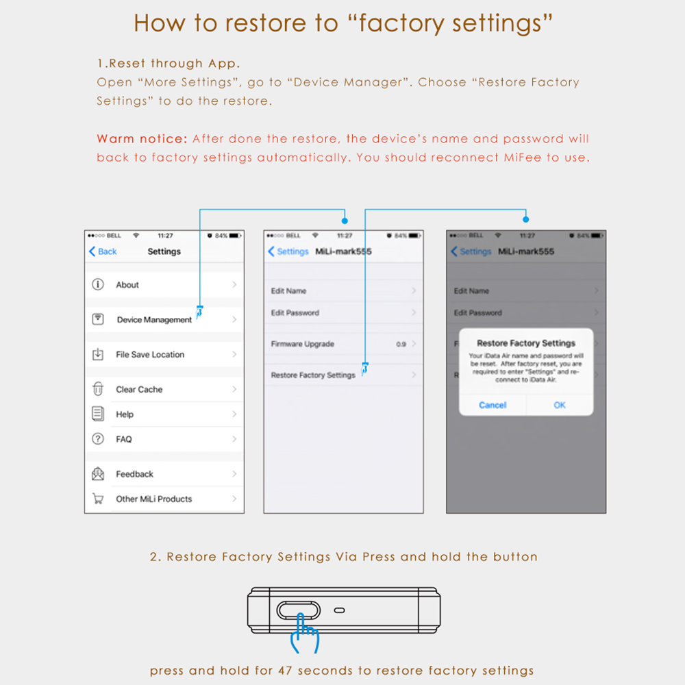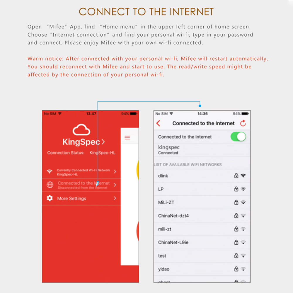 Note: After connected with your personal wifi, Mifee will restart automatically. You should reconnect Mifee and start to use. The read/write speed might be affected by Internet connection.
