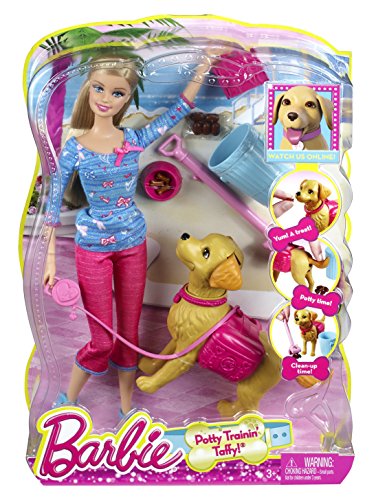-. Feature : Barbie doll shows how much she loves her pets by taking good care of them / With the Barbie Potty Training Taffy set, you can help Barbie doll feed and clean up after her pets / This pet actually pees and poops! / Includes Barbie doll and her sweet dog, Taffy, complete with dog-food-toting pack / Additional accessories include doggie food dish with treats, a pooper scooper, trash can and more!