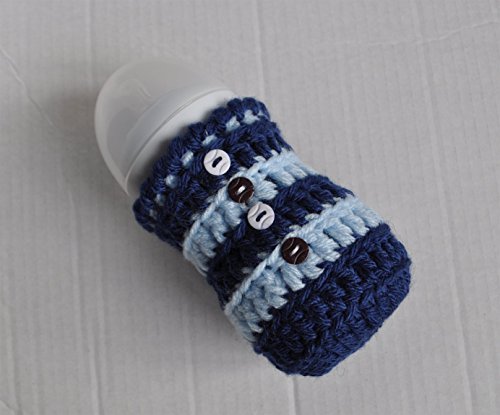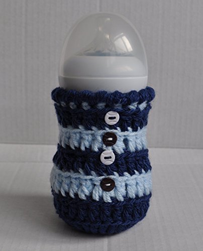 Handmade Crochet striped baby bottle cover embellished with buttons, made for Avent Natural bottle. Also fits others of similar shape and size, such as Avent Classic 260ml and MAM 260ml. These bottle cosy will keep the milk insulated, they also have elastane fitted so it grips on to the bottle for a snug fit. This would make a great gift for a mother-to-be as a babyshower gift. Care Instructions: -Hand washable, machine washable at 40 degrees, lay flat to dry. 95% Acrylic 5% Elastane. Please note that the bottle is not included.