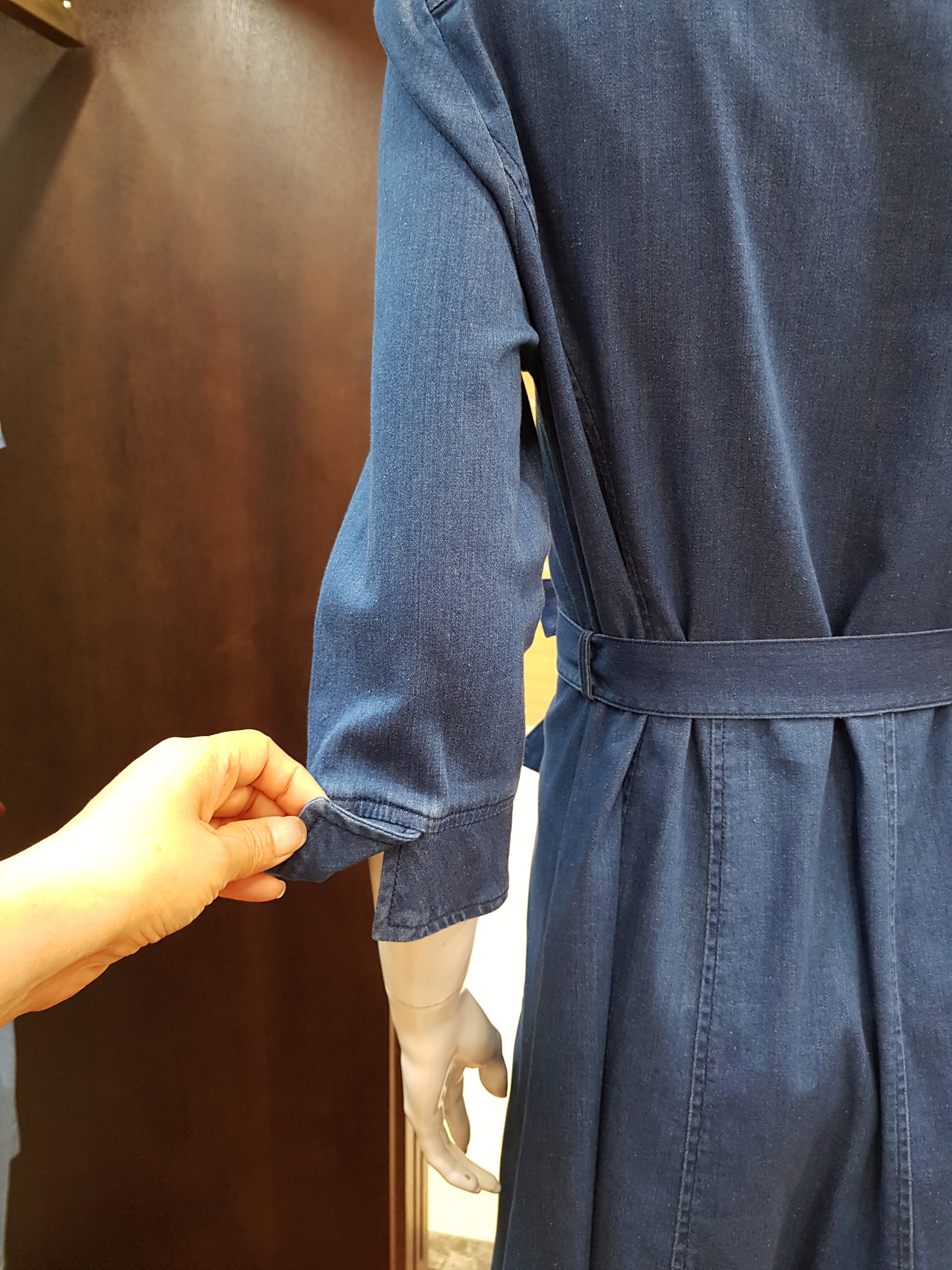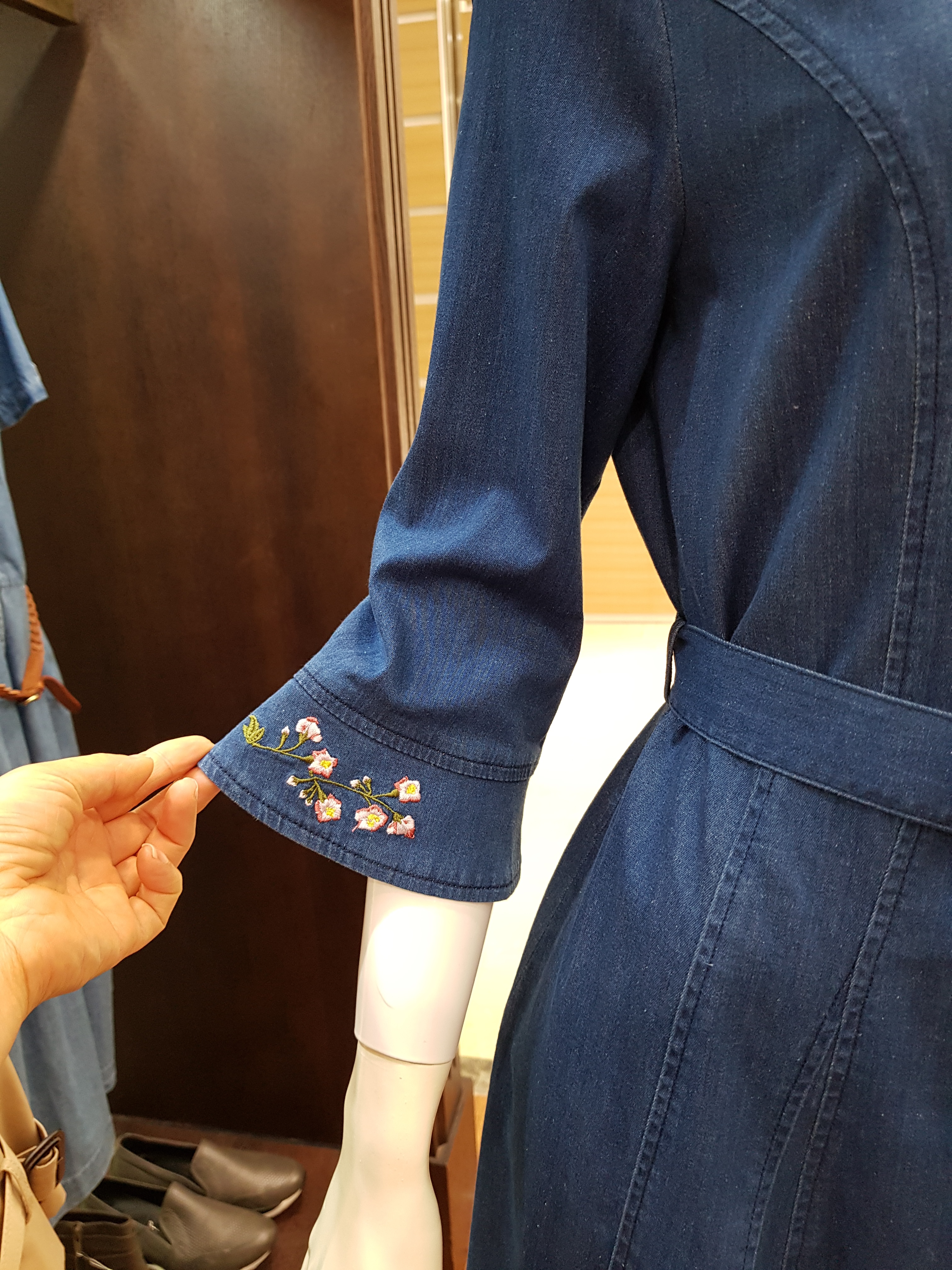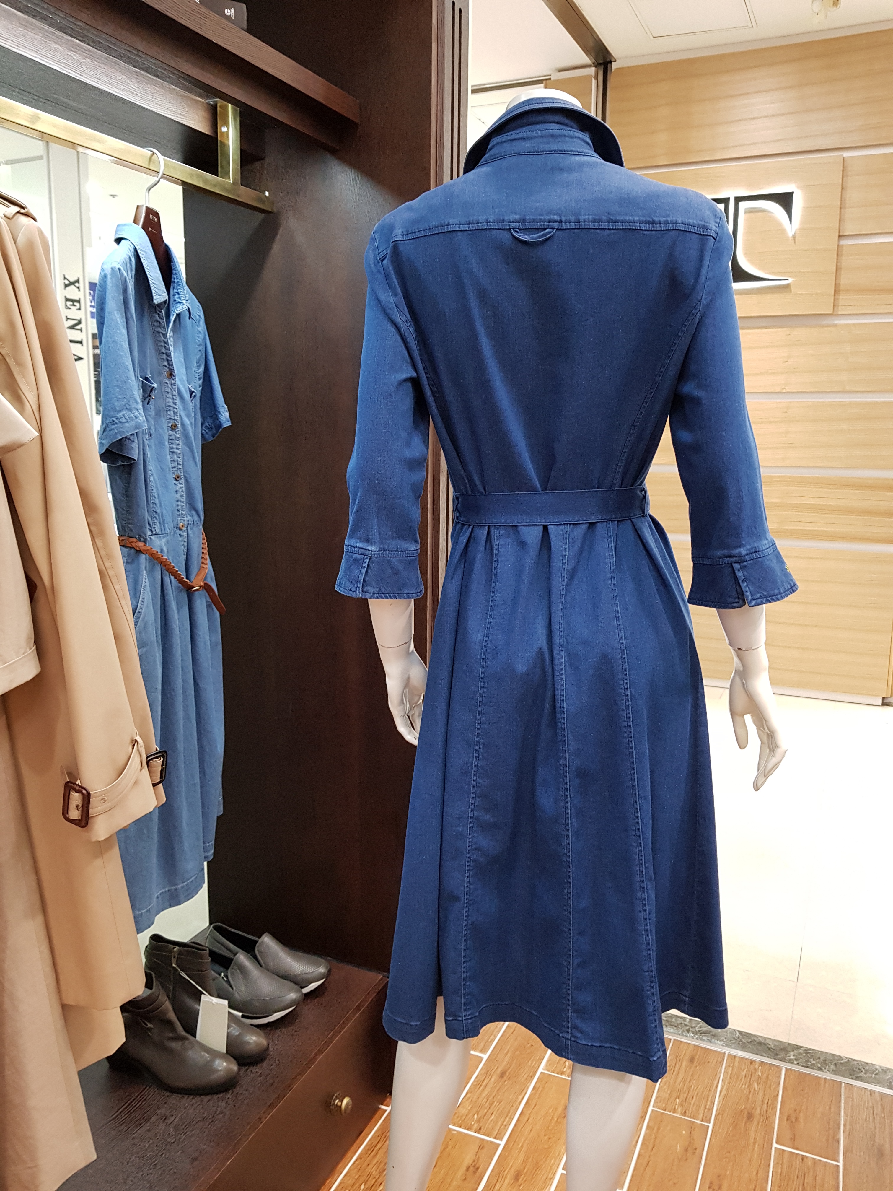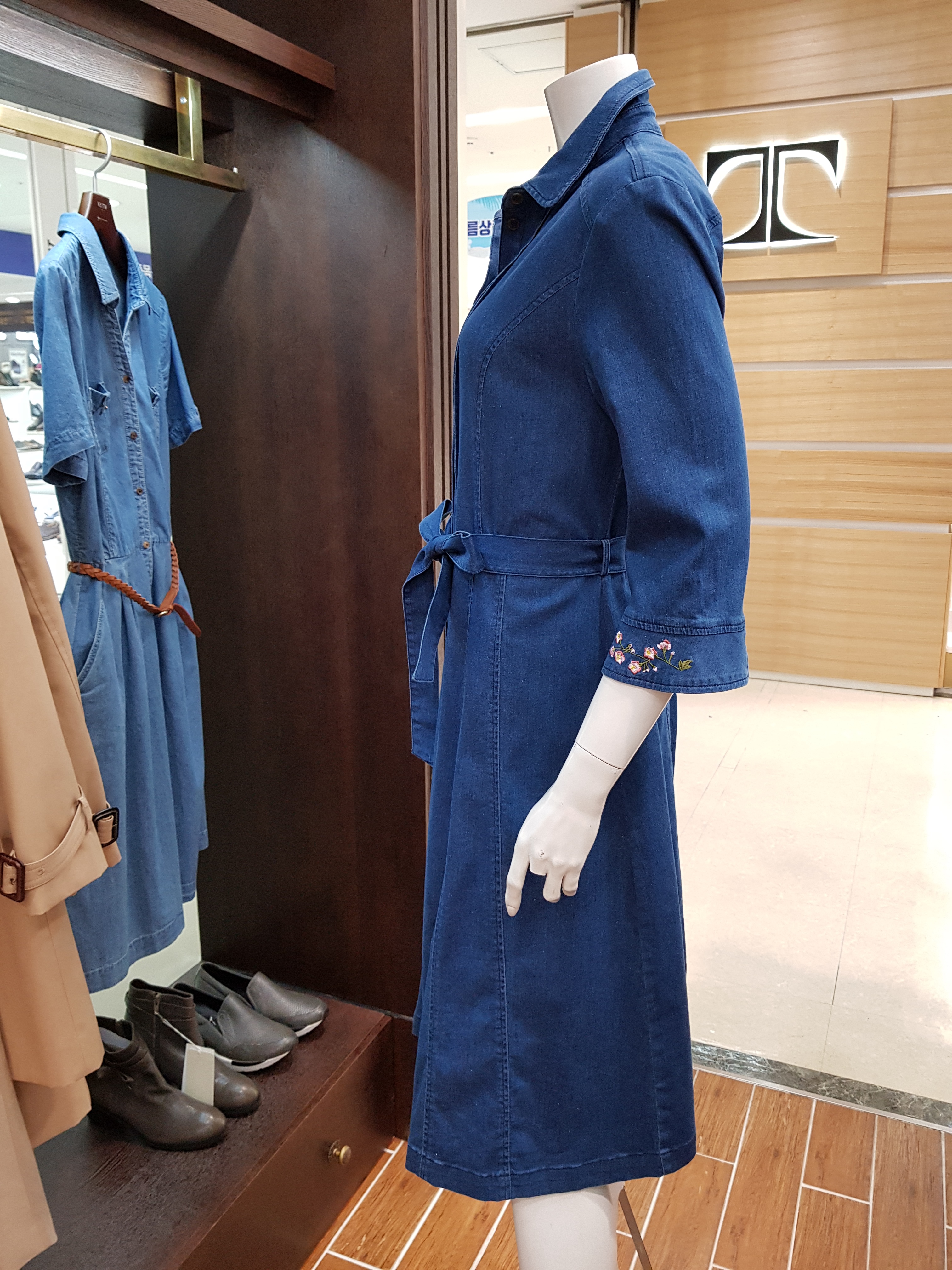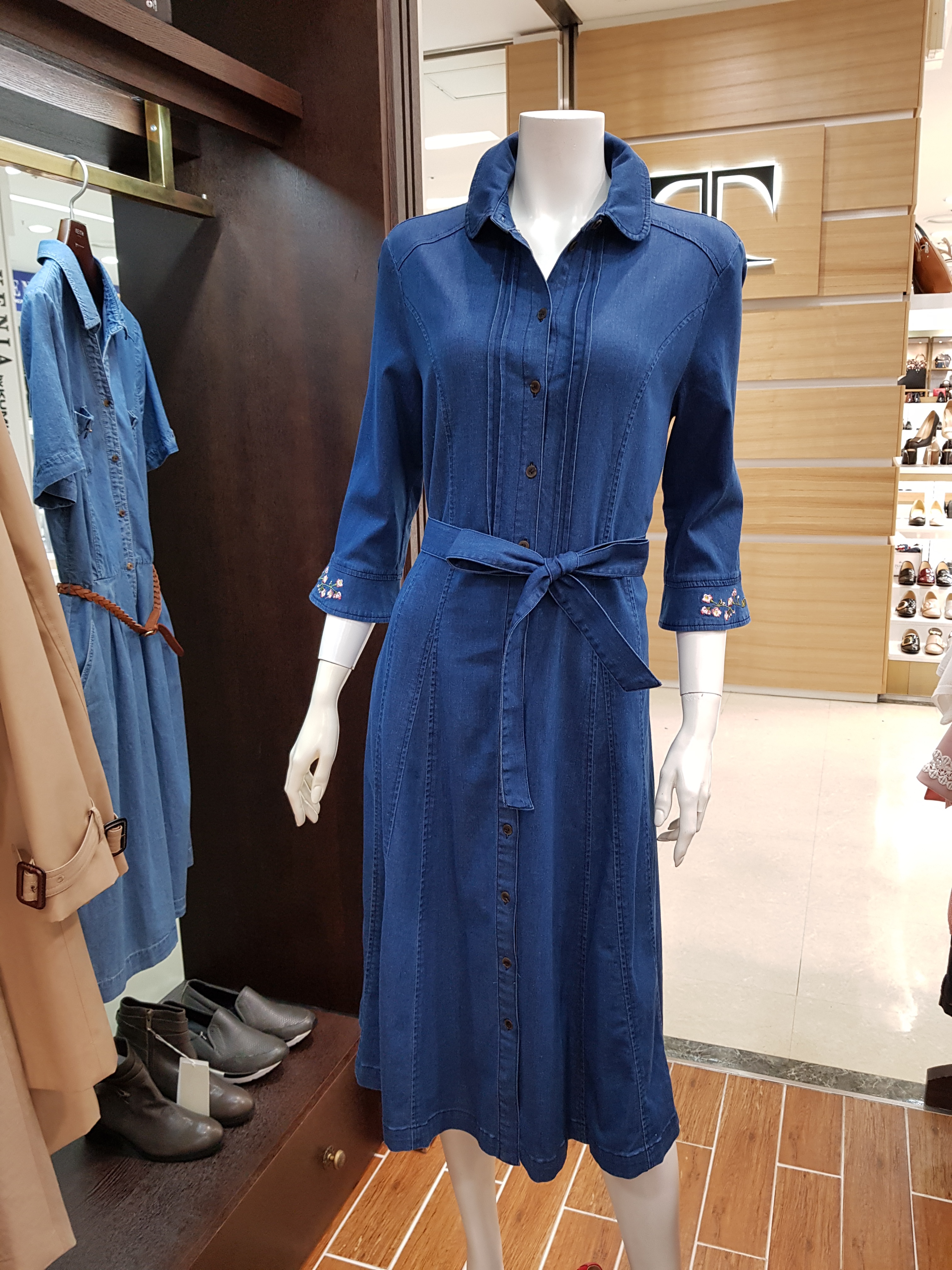 블룸스버리~플레어스커트의 사랑스런 데님원피스입니다 유행없이 인기있는 데일리로 착용하기좋으며 전체앞트임이라 편안한 신축성좋은 아이템입니다 총장104센티입니다