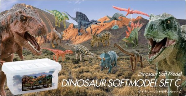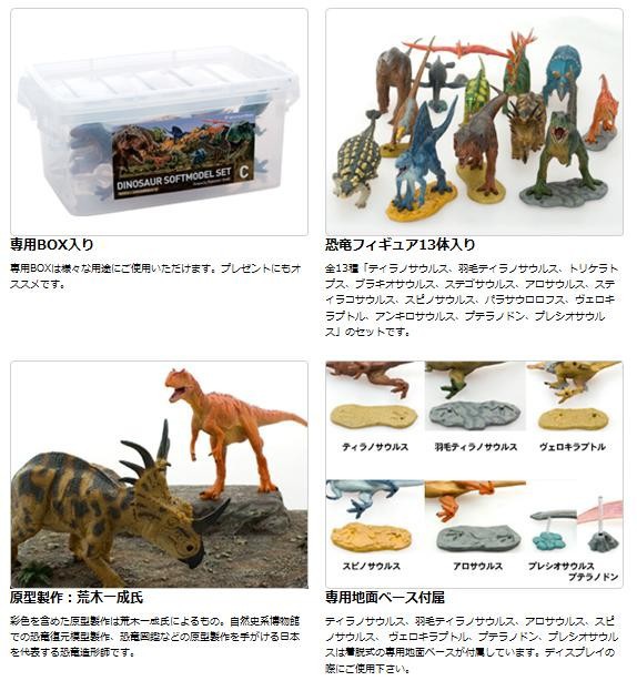 ダイナソーソフトモデル「ティラノサウルス、羽毛ティラノサウルス、トリケラトプス、ブラキオサウルス、ステゴサウルス、アロサウルス、スティラコサウルス、スピノサウルス、パラサウロロフス、ヴェロキラプトル、アンキロサウルス、プテラノドン、プレシオサウルス」の13体セットです。専用BOX入りでギフトにぴったりです。 |
