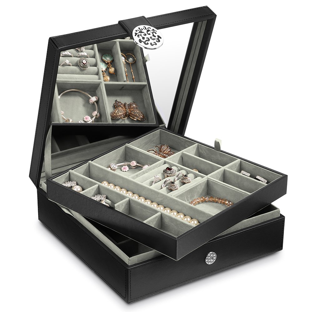 小さな仕切りケースはジュエリー好きには必須といってもいいのではないでしょうか。Cozzine ジュエリーボックスは2層タイプのデザインで合計24個の仕切りが搭載しています。しかもお好みに合わせて仕切りの形と大きさが調整できます。どんどん増えていくジュエリー・アクセサリーをかしこく綺麗に収納・整頓・整理できます。 シンプルなデザインがおしゃれなジュエリー収納ケースです。容量も結構あり、散らばっていたアクセサリーがまとまって収納できたので部屋がすっきりしました。見た目も上品で重厚感のある設計なのでどんな雰囲気のお部屋にも馴染みます。 専用のマグネットバックルがあり、 超強力磁石で密封性がよくてよりよく使いやすくなります。普段使いのアクセサリーから記念日の高級ジュエリーまでお大切なものをお守りします。 ミラーが付いていますので、ピアスやネックレスなど装着するときやちょっとした身だしなみを確認する際には非常に便利です。お出かけ前でもバタバタすることなく、その場でアクセサリーを選びながら付け替えが可能です。 外はPUレザーで、内部はベルベットでジュエリーを傷つけず大切に保管できます。指輪、ピアス、腕時計、ブレスレット、イヤリングなどを一目でパット見渡せるから選ぶのも非常にスムーズになります。プレゼントやご褒美ジュエリーをきれいに飾るように仕舞えば見て楽しめて自分だけの特別な宝箱にしましょう。