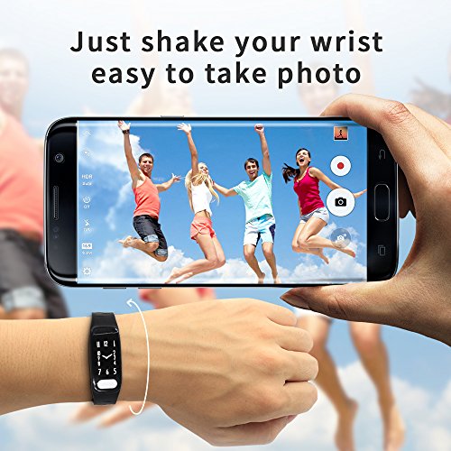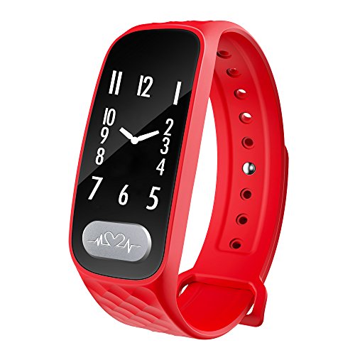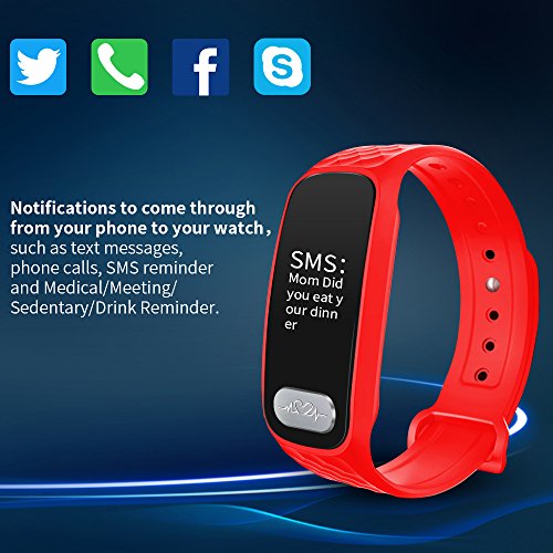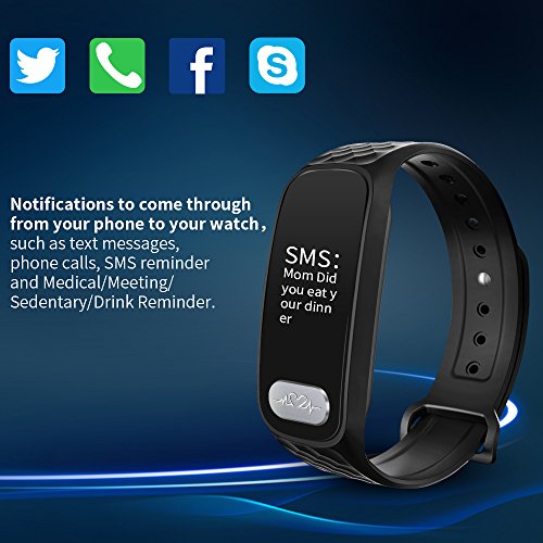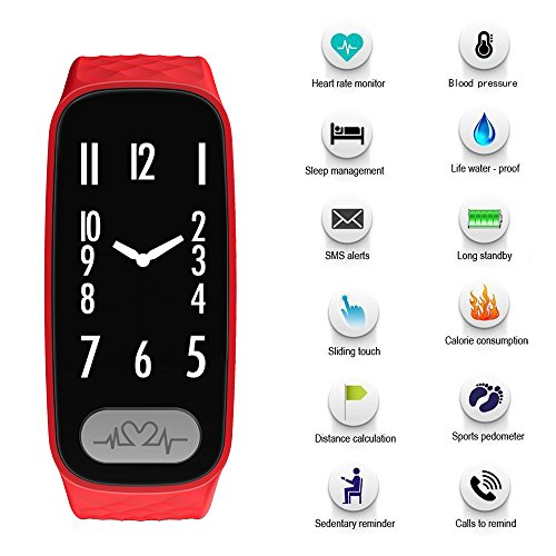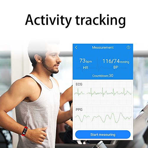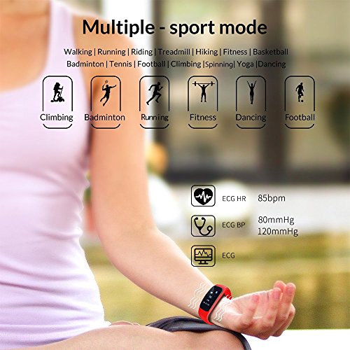 -. Feature : Multi-functions Activity Tracking: such as Pedometer, Distance, Calories Burned Measuring, Sleep Monitor, Phone Call ID Show/SMS Text Show/Social Media Notification(Facebook Twitter Skype etc), Camera Remote Control, Meeting/Medicine/Sedentary/Drink Reminder. / Blood Pressure Heart Rate Monitoring with ECG Display: quickly measure BP and HR during wearing. Electrocardiogram display needs to select measurement in APP and put finger on metal part of screen. All data will show on screen and sync to Phone App. / Two Timekeeping Display (Analog / Digital mode ). Battery support USB fast charging and max standby 10 days. This wristband compatible with Bluetooth 4.0, Android 4.4, IOS 8.2 or above. Download "WearHeart" APP from Google Play or Apple Store, or scan the QR on instruction. / Touch screen, Find Your Phone, Anti-Lost, Sports Target Remind, Auto Wake Screen if wrist lifts. IP67 resistant for dust, rain, washing, sweat and water splash. Can't be used in swimming or diving. / Materials: 0.96 inch OLED Screen, 1.9 * 0.8 * 0.4 inch plastic case, TPU band. Package includes one smart band with manual instruction. ( A better instruction of electronic edition is available, require with messages).