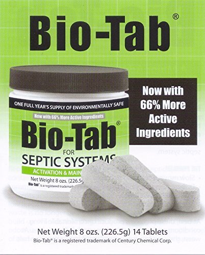 -. Binding : Kitchen -. Brand : Bio-Tab -. Color : Beige Tablets -. Feature : Convenient year supply packaging, with a handy calendar on the lid to track your monthly usage. / It is a non-corrosive and non-poisonous product that will not harm plumbing or septic systems. / Easy to use .. No messy liquids or dusty powders. / Keep your septic tank healthy for only $4.16 per month. / Composed by organisms deemed safe by the EPA and is non-toxic to humans and animals. -. IsAutographed : 0 -. Label : Century Chemical Corp -. Manufacturer : Century Chemical Corp -. Model : 6319027 -. MPN : B011FHAU1U -. PackageQuantity : 14 -. PartNumber : B011FHAU1U -. ProductGroup : Home -. ProductTypeName : HOME -. Publisher : Century Chemical Corp -. Studio : Century Chemical Corp -. Title : BioTab for Septic system (14 Tablets) 8 ozs (226.5g)