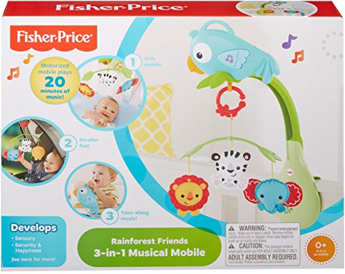 3-in-1: Musical crib mobile with motorized action and up to 20 minutes of lullaby music. Linkable stroller mobile for on-the-go. Take-along musical birdie toy “knows” when it’s on the go & automatically switches to baby-activated music mode with short, fun tunes