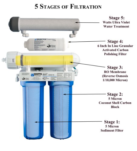 This Watts five stage reverse osmosis system provides high quality water at an affordable price. It generates purified water for drinking, cooking, hydroponics, aquarium and the unit removes hardness, heavy metals, toxins, bacteria and many other tap water impurities. The equipped Watts UV-R sterilization lamp makes this model more suitable for potential highly contaminated water source such as well or ground water. This system filters your water with five unique stages of filtration technology in order to provide to you the best quality water available in your home. Starting with the first stage, a five micron sediment filter this filter traps particulate matter like dirt, rust, sand, silt and sediment that will affect the taste and appearance of your water. The second stage has a five micron coconut shell carbon block filter that provides reduction of chlorine, chloramine and other materials in your water that can cause bad taste and odors. The third stage is the Certified RO membrane which is the heart of the reverse osmosis system. System comes complete with all filters and needed fittings for standard installation. Includes lead free long reach chrome faucet.