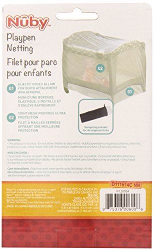 Nuby Playpen Netting fits most playards. It helps to protect the child from mosquitoes and other insects. Package includes a storage bag. Machine Washable.