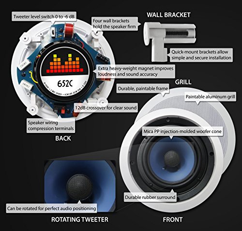 Thousands sold - the Silver Ticket 6.5 inch 80-Watt 2-Way In-Ceiling Speaker is a versatile speaker meant for anything from simple stereo applications to whole-home audio and theater systems. Suitable for 5.1, 6.1, and 7.1 home systems. The woofer cone is injection-mold mica polypropylene to ensure high-quality, long-lasting sound that will bring movie action and music vocals to life. The high-grade rubber edge allows for true audio accuracy and quality that will last. The 20mm silk dome tweeter pivots for micro-tuning of the sound placement. Included above and beyond competitors is the extra heavy weight, high-strength magnet with its field of energy perfectly tuned with the voice coil - it's all about true efficiency. What does this all mean? - It means you get an excellent speaker that is loud, but not noisy. The speaker will not sound harsh when turned up; it maintains excellent clarity at all volume levels.