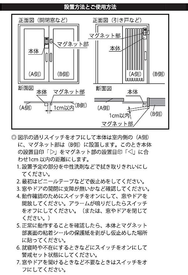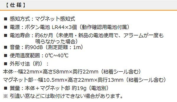 | 窓やドアが開くと、大音量アラーム(約90dB/測定距離:1m)でお知らせ。スイッチをOFFにするか、本体とマグネットを再度近づけると、音が鳴り止みます。電池タイプなので配線不要。裏面の粘着シールで簡単に取り付けられます。開閉窓や引き戸、開閉ドアなど色々な所に取り付け可能です。 |