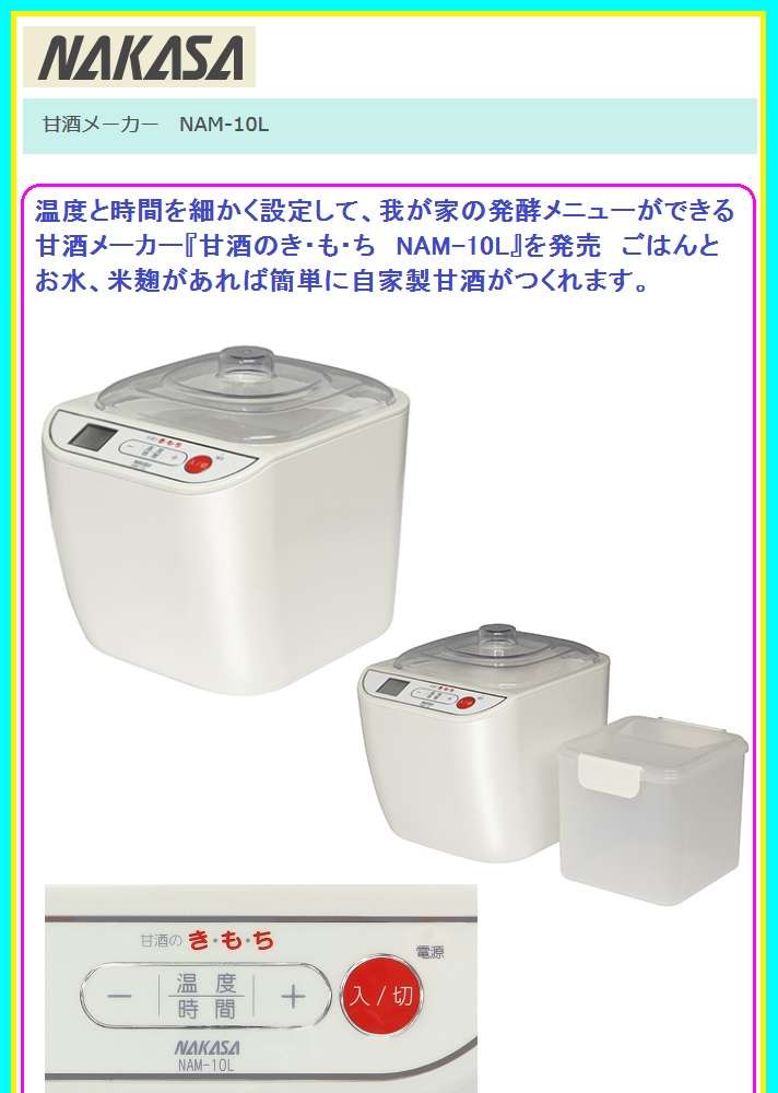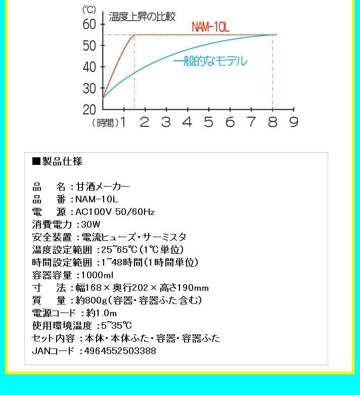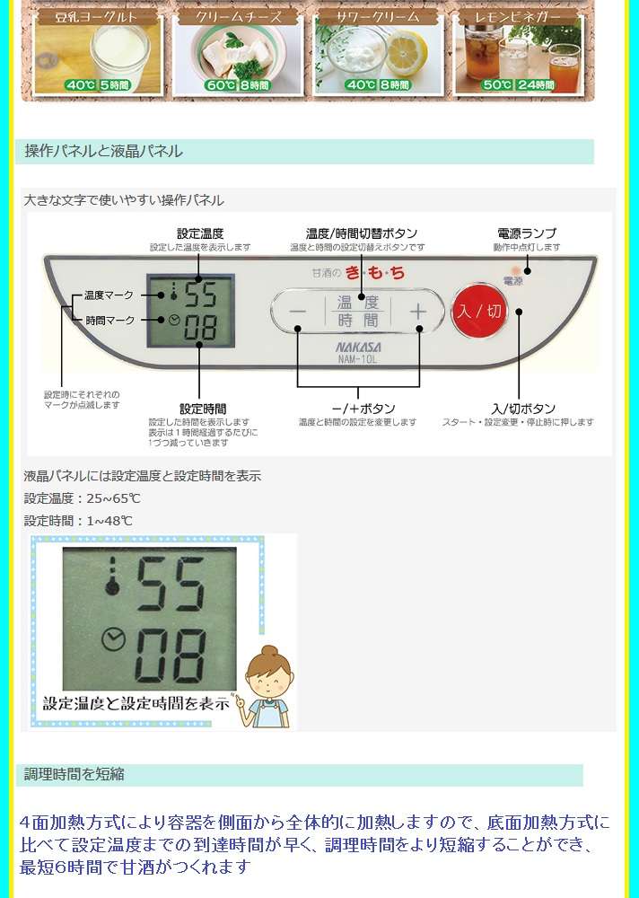 ●4面加熱方式により容器を側面から全体的に加熱しますので、底面加熱方式に比べて設定温度までの到達時間が早く、調理時間をより短縮することができ、最短6時間で甘酒がつくれます