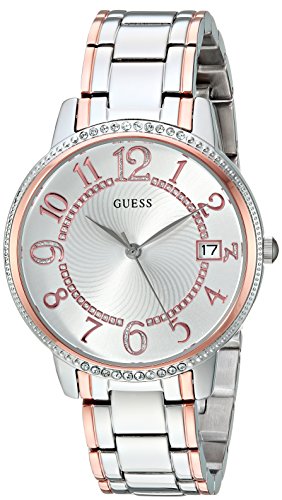 Rhinestones dance around the bezel of this midsize analog timepiece, designed with silver and rose gold-tone finishes for a high-shine look with date function