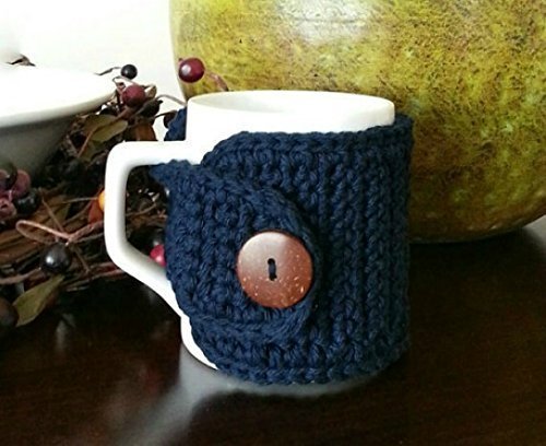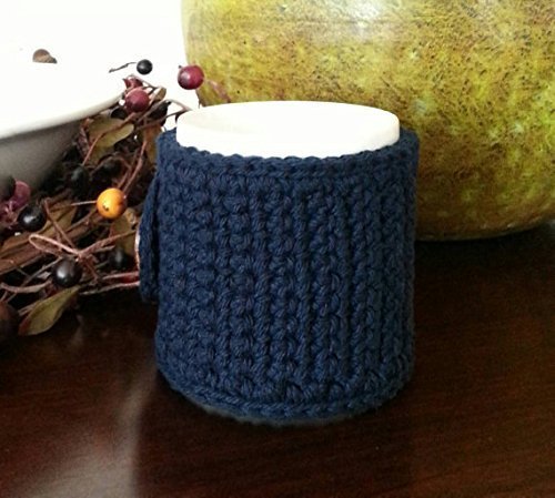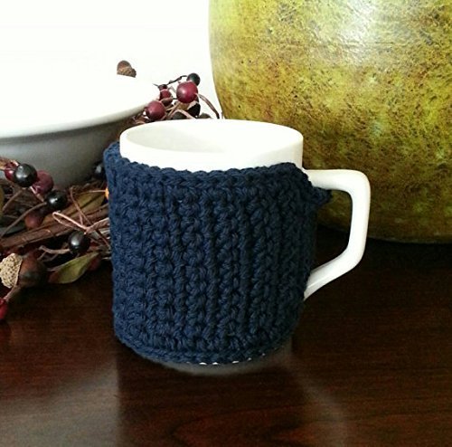 Product Description Wrap your favorite coffee mug or cup in this navy handmade cozy. This cozy accessory makes a nice gift for those coffee/tea loves in your life. Add the cozy to a gift basket, give it as a Secret Santa gift at the office, or to a friend of family member. The cup pictured (for display purposes only) has a circumference of 10.5 inches and a height of 4 inches. The cozy is created with 100% cotton yarn. 0