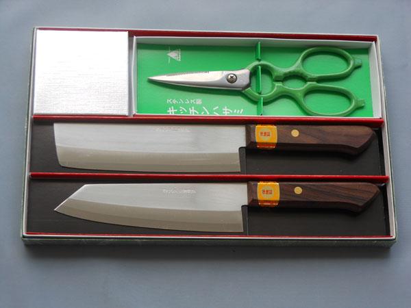 | サイズ | 文化包丁:刃長165mm、薄刃包丁:刃長150mm、キッチン鋏:刃渡り80mm 個装サイズ:33×22×2cm |