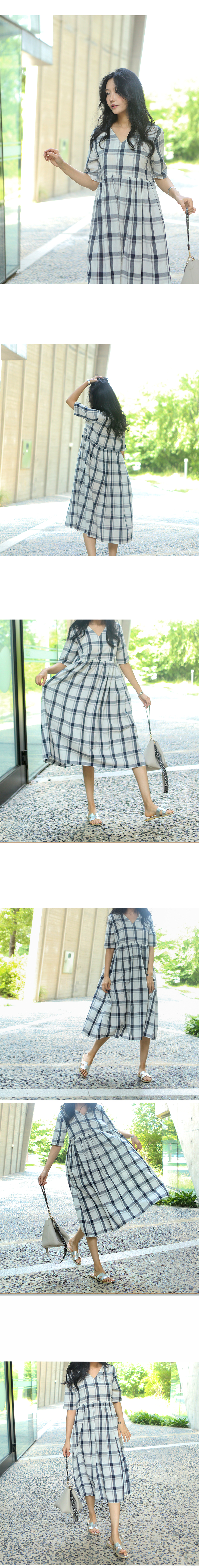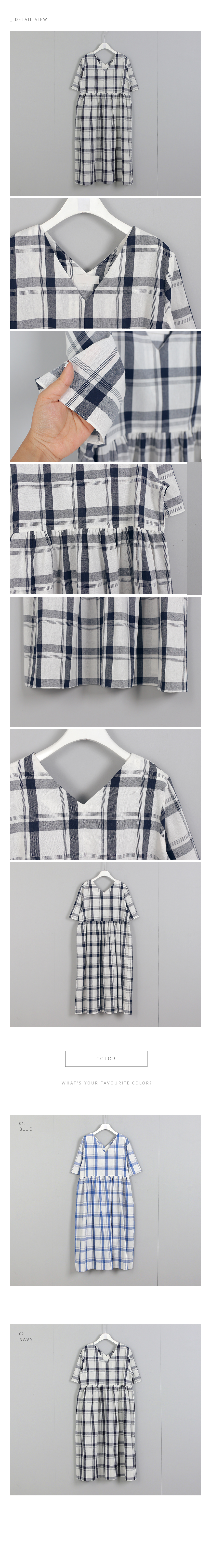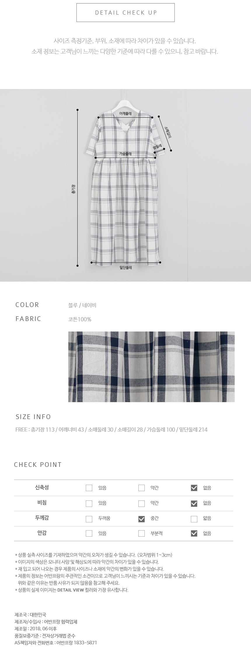 경쾌한 체크패턴과 작은 브이넥으로목선이 깔끔하고 어깨선에서 이어지는소매라인은 짧지 않아 단정해요가슴선아래에서 잔잔하게 셔링을 덧대어풍성한 플레어라인이 여유있는 핏으로상의핏이 제어깨선에 단정하게 잘 맞아편안하지만 핏이 차분하답니다쾌적한 코튼 100%의 소재감으로편안한 데일리룩으로 산뜻한 원피스에요색상은 블루, 네이비사이즈는 FREE 44~66반