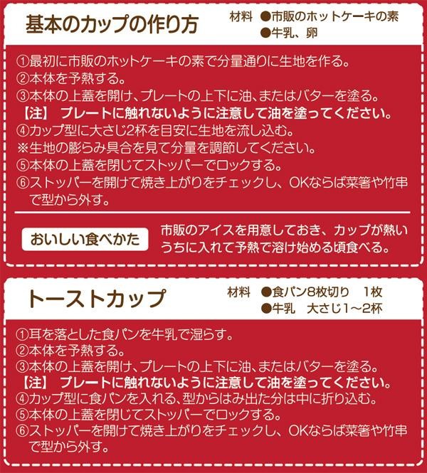 | 食べれる器が作れちゃう、プレス式のワッフルカップメーカーです!!フルーツやアイス、サラダやおかずをワッフルカップに盛り付ければとってもオシャレ♪ワッフルカップは盛り付けした食材と一緒においしく食べられます。 |