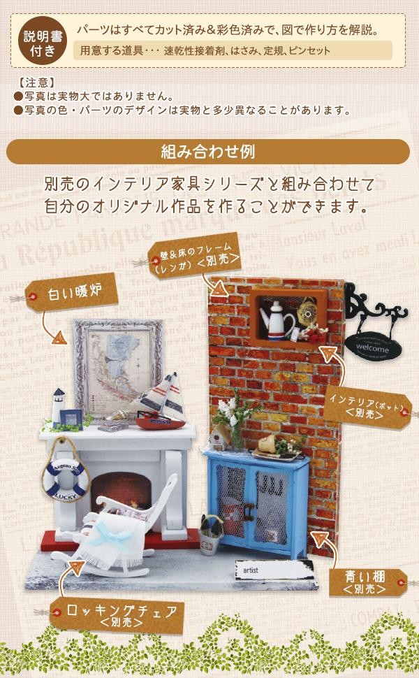 白い暖炉のミニチュアキットです。白い暖炉におしゃれな小物を飾って、単体でインテリアとしても、ミニチュア作品のアクセントとしてもピッタリです。分かりやすい説明書付きなので、初心者の方でも楽しく簡単に作ることができます。 |