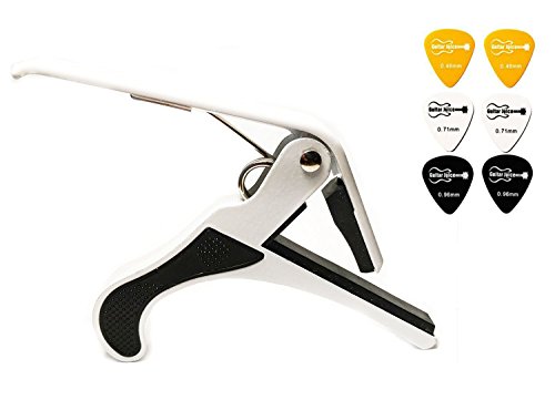 The Guitar Juice GJ-B01 has a longer bar to make it compatible with Acoustic, Electric, or Classical guitars and also Mandolins and Banjos, it keeps your instruments safe with its soft protective pads. It also helps to keep you in tune with minimal fret buzzing. You can be lightning fast up and down the fret board with the inverted quick-change capo handle and grip that goes up instead of DOWN and does not get in the way of your fingering hand. Professional quality for years of use, and who can't use extra guitar picks, so we include 6 picks: (2) Orange .46mm, (2) White .71mm, and (2) Black .96mm. The spring clamp trigger style allows you to quickly and smoothly attach it to your stringed instrument. The hand grip has an inverted design that does not get in the way while you are performing. Designed for beginners and professionals Benefits: * Inverted handle that makes it easy to quickly adjust or remove. * Padded bars to grip the neck delicately to protect your instrument from scratches. * Minimal string buzzing. * Strong tension allows compatibility with many instrument neck sizes. * Changes the key of the song by making the tone higher and brighter. * Made of: Aluminum alloy, plastic and rubber. STARTER KIT: Every player needs a good capo and extra picks - Makes a great gift. 1 YEAR WARRANTY: 100% Money Back Guarantee Click Add To Cart to start rocking out and enjoying your new Guitar-Juice Capo 0