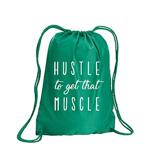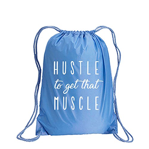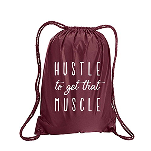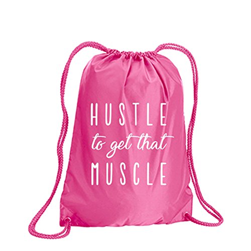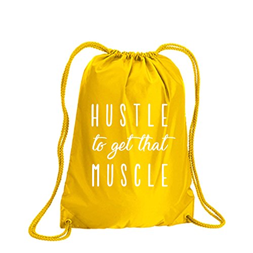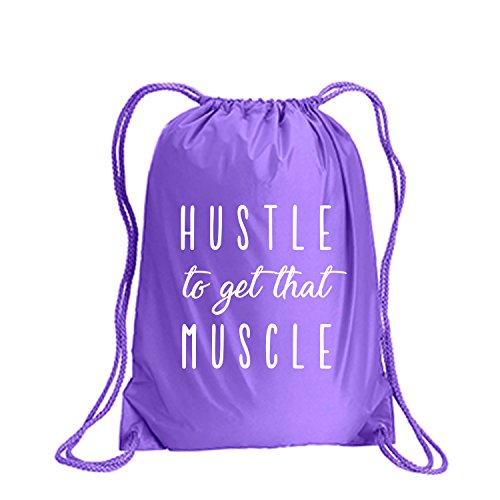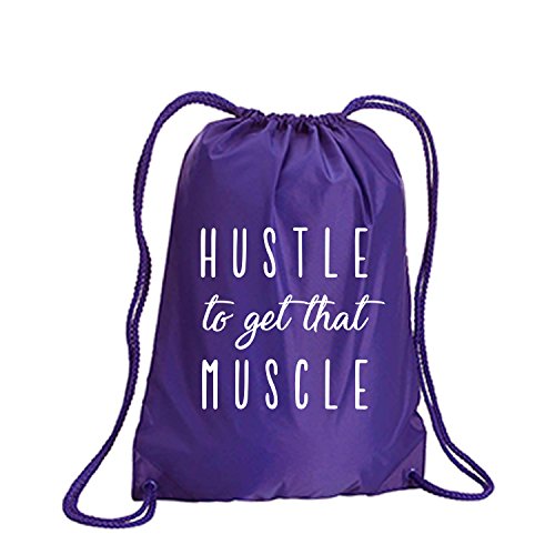 Product Description This durable and stylish nylon tote features "HUSTLE to get that MUSCLE" on a cinch pack tote with white ink. Bag comes in small and large sizes and is made of a durable 210 Denier nylon and has color-matched draw cords. Printed in the USA on an imported bag. 0