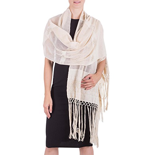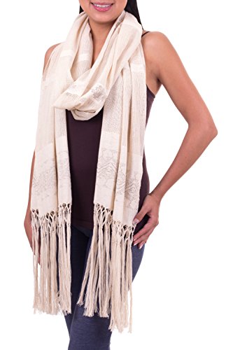 About this item: Woven on a backstrap loom, this enchanting shawl features hand knotted fringe and wheat motifs in jade. The textures are created by alternating bands of tightly and loosely woven threads, and elegant geometric motifs at each end reflect traditional Guatemalan artistry. Luisa Villavicencio's family cultivates cotton in several natural colors - jade, brown and ivory, or raw cotton. In fact, people are surprised to learn that no dyes are used. The family is involved in the entire process, from growing the cotton, to weaving it and transforming it into apparel. 90" L x 21.75" W - Eco-Friendly: crafted with sustainable and biodegradable textile fibers