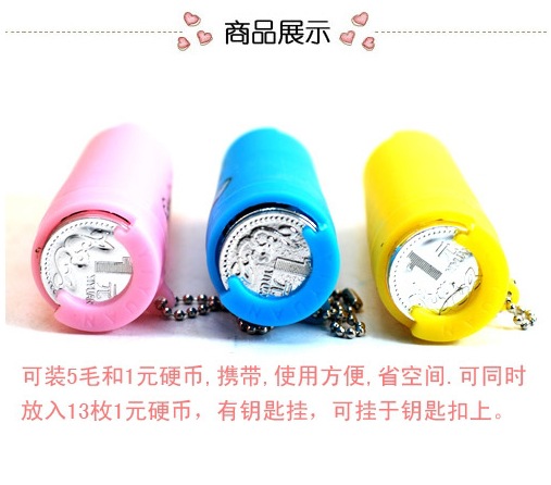 Can be installed 5 wool and 1 yuan coin? portability? convenient use? save space. At the same time into about 10 pieces of 1 dollar coins? a key hanging? can be hung on a key ring。