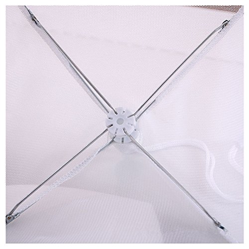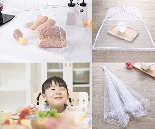 EASY STORAGE AND COLLAPSIBLE : Collapsible & reusable umbrella dome shape with outer skirt makes sure to keep flies out away from food. Any indoor or outdoor activities, these collapsible food covers are must have. Easy to open and close, very compact when closed takes up little to no storage room.