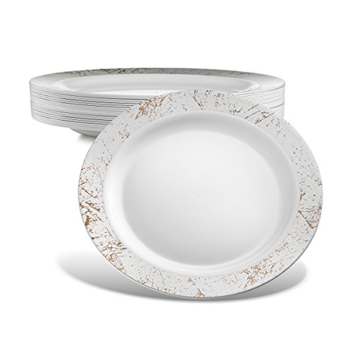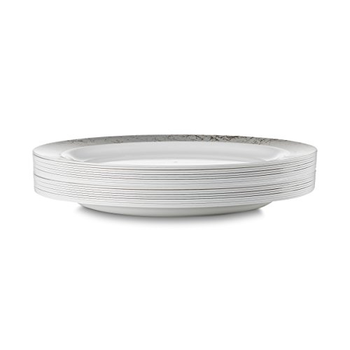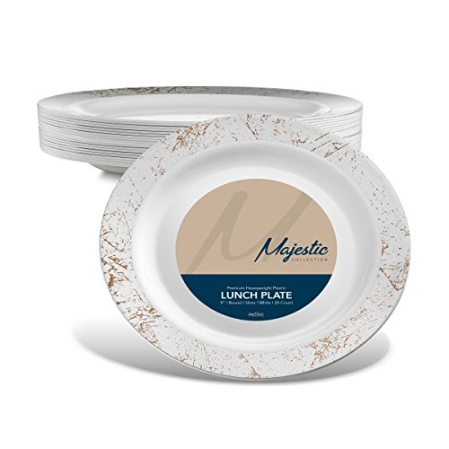 -MAJESTIC IS A MASTERPIECE!!! - High Gloss Shine...Stark Snow White ...Lustrous silver border....Rich Distinctive Look...all these characterize our MAJESTIC round plate collection created for sophistication and grace. Dress your table to perfection. Awe your guests with these silver speckled dinner plates, yet quit the hassle of washing dishes. Go green, go disposable so you're not left with a huge cleanup once your guests have left. Or, rewash and store for your next special occasion. --BENEFITS AND FEATURES-- ★Classical round shape design with silver speckled border to set your table to perfection ★Wow your guests and yourself alike ★Heavyweight premium quality plastic to ensure no sagging, tearing or breaking ★Perfect choice for weddings, receptions, banquets, reunions, holidays, or family get-togethers ★Great for outdoor entertaining too ★Just toss these disposable dishes and be on your way!!! ★Fun and Frugal?? Wash and reuse for your next event ★Pack of 20 Majestic heavyweight round white 9-inch lunch plates with silver rim Isn't life better when we get together more often? Whether a backyard barbecue or an extended family reunion, we believe in the value of spending time with friends and family. Busy lives and long to-do lists often get in the way, but when we simplify events with beautiful disposables, we do get the time to get together. There's no better feeling. So what are you waiting for? Change The Look Of Your Table, WOW Your Guests With These White Silver Border Fish Plates, And Set The Bar At An All-Time High. Type PRESTEE in the AMAZON SEARCH BOX to view our complete line of china-like dishes, plates, cutlery, party tumblers, and mini plates for your upscale celebration.TRUST US, You'll be GLAD you did!! #1Unique Round Place Setting CLICK ADD TO CART NOW!!! 0