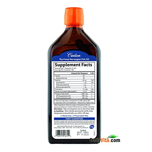 Finest Fish Oil Omega 3 500 ml Liquid - Natural Lemon Flavor Ingredients per teaspoon 5ml Calories (energy) 40 Calories from fat: 40 Total Fat: 4 gm Saturated Fat: 1 gm Polyunsaturated Fat: 2 gm Monounsaturated Fat: 1 gm Cholesterol: 15 mg Vitamin E Natural (d-alpha tocopherol) 10 IU Omega-3 Fatty Acids (from fish oil) 1600 mg Antioxidant Blend 14 mg EPA (Eicosapentaenoic Acid) 800 mg DHA (Docosahexaenoic Acid) 500 mg Other Omega-3 Fatty Acids: 300 mg Ingredients: Omega-3 fish oil, natural lemon flavor, ascorbyl palmitate, natural tocopherols. Directions: Take one teaspoonful one or two times a day AT MEALTIME. To retain freshness after initially opening the bottle keep refrigerated and preferably use within 3 months.