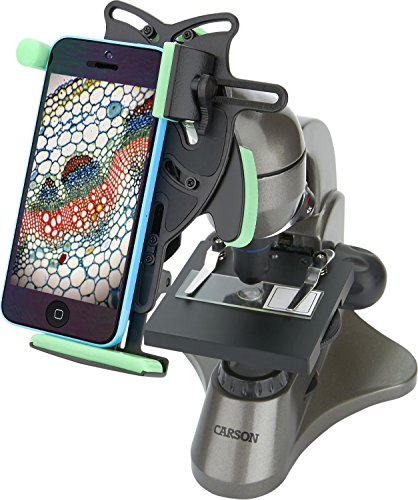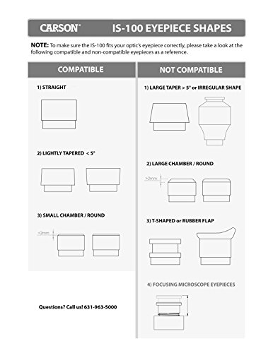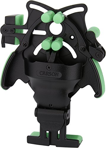 The HookUpz Universal Smart Phone Optics Adapter (IS-100) from Carson Optical allows users to connect a multitude of optics to their smartphones and then use their built in camera apps to take amazing pictures and videos. Use the IS-100 to connect your phone to binoculars, spotting scopes, telescopes, microscopes (including slit lamps), monoculars, borescopes and so much more! In regards to connecting your universal adapter to optical devices, the IS-100 fits onto optical eyepieces with an outer housing diameter between 20mm-58mm (0.8 inch - 2.25 inch) and a depth of at least 14mm (0.6 inch). Your optical eyepiece can be straight or slightly tapered but please note that complex shaped eyepieces may not work. The IS-100 is compatible with 99% of smartphones in the marketplace and can be used with or without a case - see the compatibility chart under the product details section for more details. The IS-100 features two point locking levers for phone alignment and also a releasable phone clamp that allows users to install and remove their phones quickly. Eyepieces held in the device are automatically centered, so only one initial phone alignment is needed, before you can quickly connect your phone to any optic. THE IS-100 IS NOT COMPATIBLE WITH RIFLESCOPES AND PHABLETS. The IS-100 features glow in the dark rubber parts to increase visibility in low light situations. It comes with an EVA storage case that has an attached carabineer clip and a lens spacer for longer eye relief eyepieces.Feature