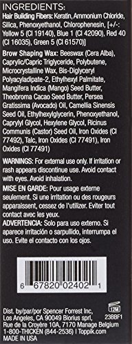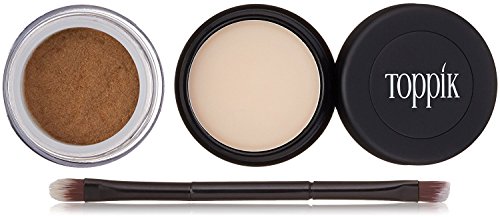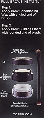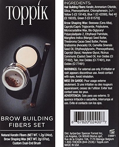 What it is: the toppik brow building fibers set makes even the thinnest eyebrows instantly thick, full and natural-looking. Brow building fibers last longer than eyebrow powder and look more natural than eyebrow pencils or gels. This 3-piece kit includes a brow wax to shape eyebrows, brow building fibers and a custom dual-end brush for wax and fibers application, making this the best eyebrow makeup for full, natural-looking brows. What it does: learn how to shape eyebrows correctly with this 3-piece eyebrow kit. The toppik brow building fibers set has 3 key components that make this groundbreaking brow set unique.. Brow conditioning wax sets and defines the shape of your natural brows. Brow building fibers adhere to brows, fill in patchiness, and give brows long-lasting thickness and color. The dual-end brush ensures simple and precise application. Product is made out of keratin fibers.Feature