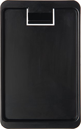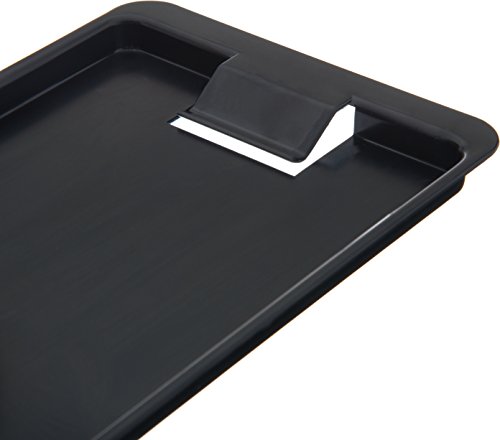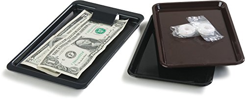 This Carlisle 302003 black check holder and tip tray is 4.37" wide, 7.75" in length, and has a clip for attaching checks. It is made of styrene for strength and rigidity. This check holder and tip tray meets NSF International standards for use in food handling and processing and is dishwasher-safe.