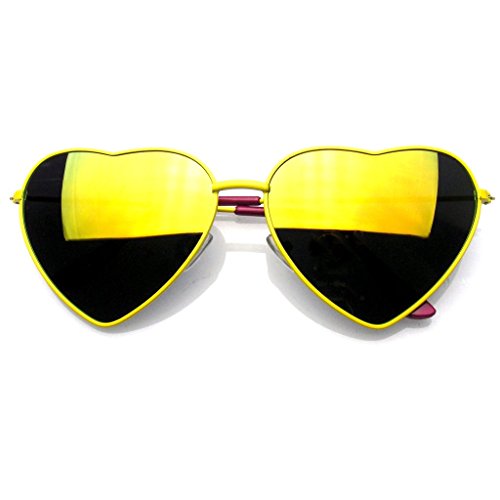 Product Description Unique flash mirror heart shape lens and comes in a variety of cute colors to match all of your outfits. Super adorable your going to love these heart shaped sunglasses. This item features a metal frame; nose piece and full mirror polycarbonate 100% UV high impact-resistant protected lenses. Make a Statement in these shades! 0