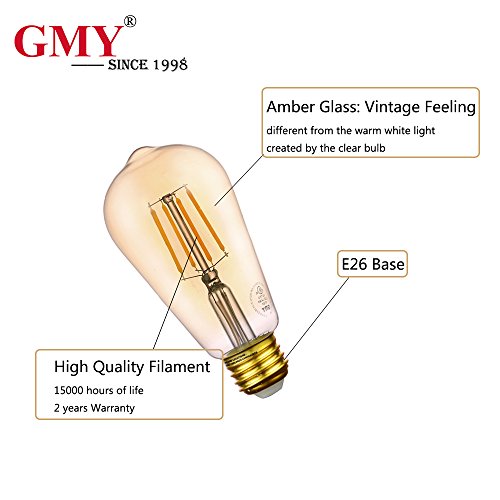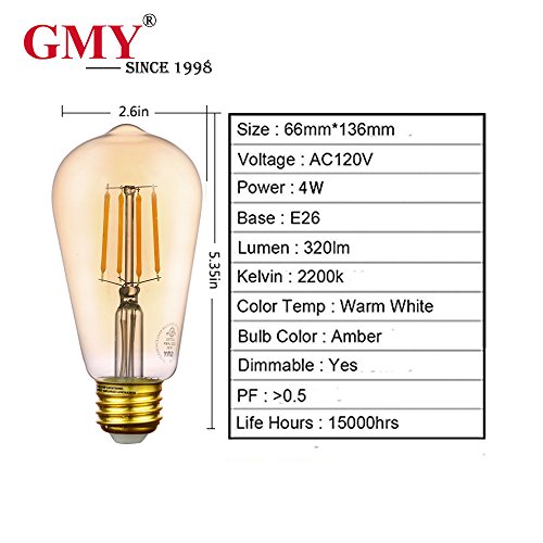 This is GMY edison led filament Vintage Style ST21 Bulb which is 4W (equivalent to a 30 watt standard incandescent light bulb),320lm,2200K,dimmable and with amber glass,perfect fit E26 lamp base.Suitable for many lighting and decor styles. Applications: Suitable for lighting or decoration. It can created a very nice and beautiful ambience.