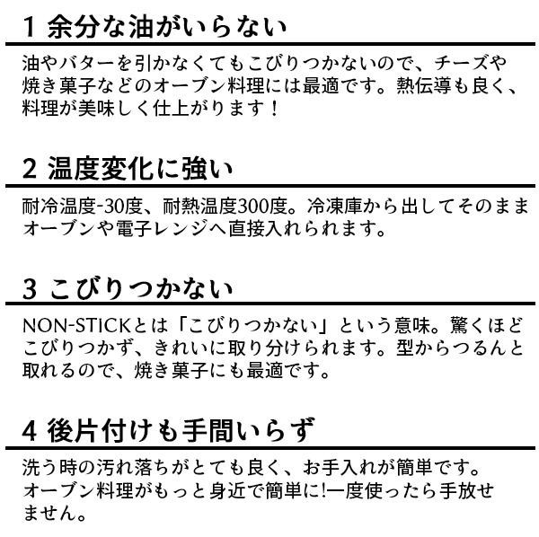 フッ素樹脂加工を施した耐熱陶器♪焼き菓子やチーズなどを使った料理も油やバターを引かなくてもこびりつきにくいので、余分な油を使うことなくヘルシーに料理ができます!!お手入れも簡単☆温かいオーブン料理から、冷たいデザートまで幅広くお使いいただけます!! |