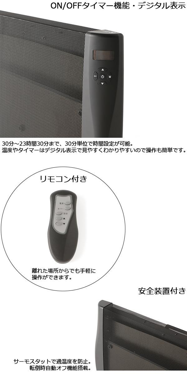 | マイカ(雲母)を使用し、効率よく放熱を行い輻射熱と放射熱で室内をじんわりと暖めることができる遠赤外線パネルヒーターです。セラミックヒーターやエアコンのように風を巻き起こすことが無いためホコリが舞ったり空気が乾燥することがありません。設定温度に合わせて断続運転するので無駄な電気代がかかりません。 |