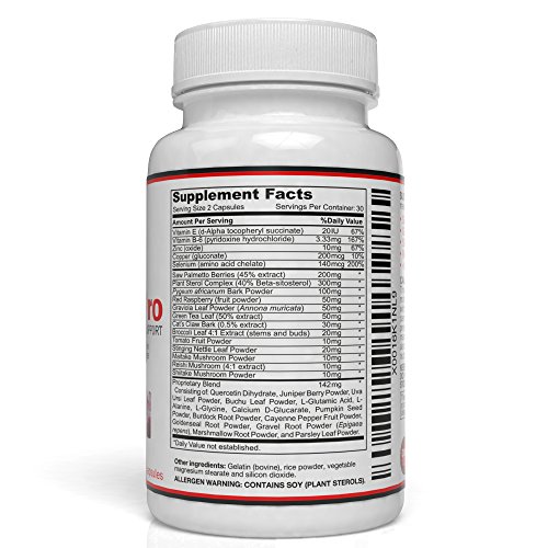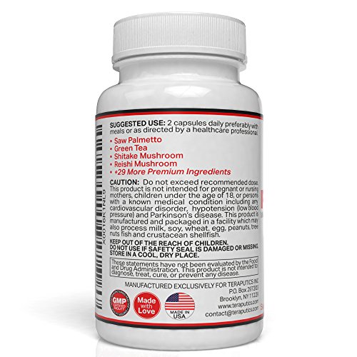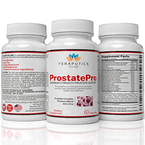 -. Feature : FREE BOTTLE - Buy your first bottle and receive a second for free (details inside packaging) / Teraputics is the leading brand of Prostate Supplement formulas - All of our ingredients are perfectly formulated adhering to the highest GMP standards of product integrity in our state of the art lab right here in the United States. / Supports Optimal Prostate Health - Contains Saw Palmetto, Green Tea, Beta Sitosterol, Mushrooms (Reishi, Shitake, Maltake), Quercetin, Juniper Berry, Pumpkin Seed, Goldenseal, Cat's Claw Bark, Cayenne Pepper, Graviola Leaf, Red Raspberry, and many many more. With 930mg per serving each bottle contains 45 servings. Our ProstatePro formula is of the highest quality and 100% pure making it a preferred alternative to other products that carry undesired side effects. / 100% Money Back Guarantee - Our ProstatePro formula is made adhering to the highest GMP standards of product integrity; so if for any reason you are not satisfied with this formula you can get a full refund with no questions asked. Our customers MUST be satisfied / Personalized Customer Support - With every Teraputics purchase our customers gain access to our team of highly trained service professionals, available to help with questions about any of our health products