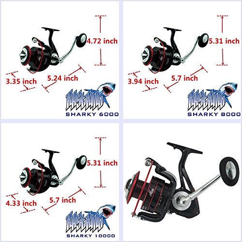 Sharky 6000 Weight 14.5oz/405g / Max Drag 30.85LB/14KG / Gear Ratio 5.2:1/ Line Capacity 0.20mm/150m, 0.235/100, 0.26/70 /Monofilament Capacity 6Lb/165 Yds, 8/110, 10/75