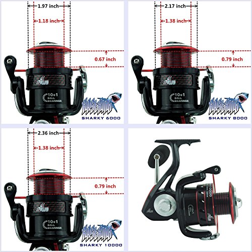 Sharky 10000 Weight 23.4oz/655g / Max Drag 48.50LB/22KG / Gear Ratio 4.4:1/ Line Capacity 0.47mm/215, 0.52/175, 0.57/145 /Monofilament Capacity 30Lb/235 Yds, 35/190, 40/160