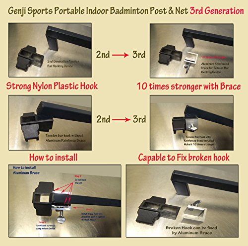 Genji Sports Portable IBF Standard Indoor Badminton Post and Net 3rd Generation. No need to drill holes on the floor or tight to the wall. Light weight 13 lb, easy to assembly, disassembly within 3 minute. Suitable for all sizes of gym, warehouse, church, play indoor or outdoor. This package comes with a set of post, a full size (20 feet) standard badminton net and a carrying bag. Specifications: Post height 155cm, width max. 6.10m (20 feet) for full size double player's court Special patented design to keep the net straight and at the standard height Very portable, weight only 13 lb Easy to assembly and dis-assemble, get ready for the game within 3 minute Comes with a full size carrying bag Comes with a IBF standard full size 20 feet net. What are the improvements in 3rd Generation Genji post and Net 1)An aluminum brace is applied to tension bar holder, to make holder 10 times stronger, capable to hold higher tension, prevent torque damage caused by player run into the post set or accidentally kick on the tension bar during the game. 2)Re-sized tension bar coupling dimensions to solved tension bars stick together problem, smooth the assembly and disassembly processes, reduce setup time to 3 minutes. 3) Each post and net set is Individually packed with heavy duty cardboard, posts components are separated in each secure area inside the package to prevent shipping damage. 4)Improved net cotton quality, reduced net gross weight, this helped the 6.1M badminton net more stable and maintain the standard 154cm height all the time. For previous Genji badminton post and net owners, we offer the tension bar holder aluminum brace set at a special rate, the aluminum brace can be used on all 1st and 2nd generations Genji portable badminton posts, it is very easy to install. The aluminum brace can rebuild broken holder to support tension bar and make posts work as normal again.